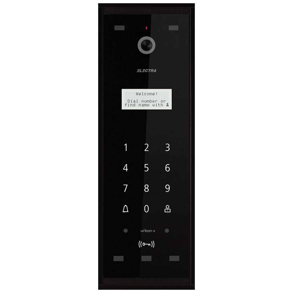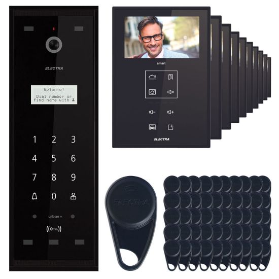 Kit videointerfon Electra Touch Line Smart pentru 10 familii, panou exterior aparent pentru max. 40 de familii, panou interior 4.3 inch, negru, cablare 4 fire.