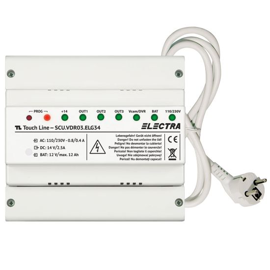 Unitate centrala de alimentare cu 1 iesire, pentru instalatii de 1 familie si blocuri, carcasa ABS ignifugat/PA66 - Gri deschis, prevazuta cu cablu si stecher, montaj pe sină DIN/pe suprafata, 130 x 141 x 73 mm;